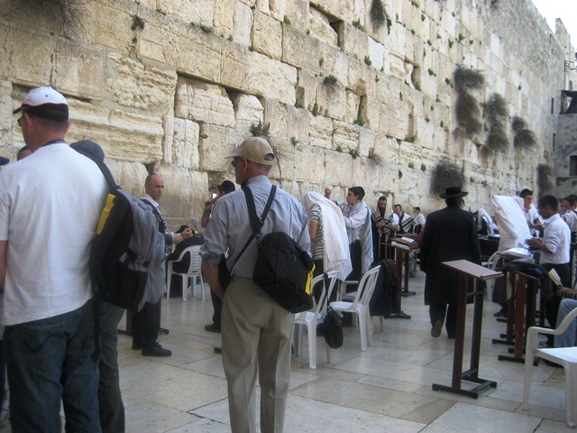 The Jewish men praying before the Western Wall. The women have their own location to the right. |